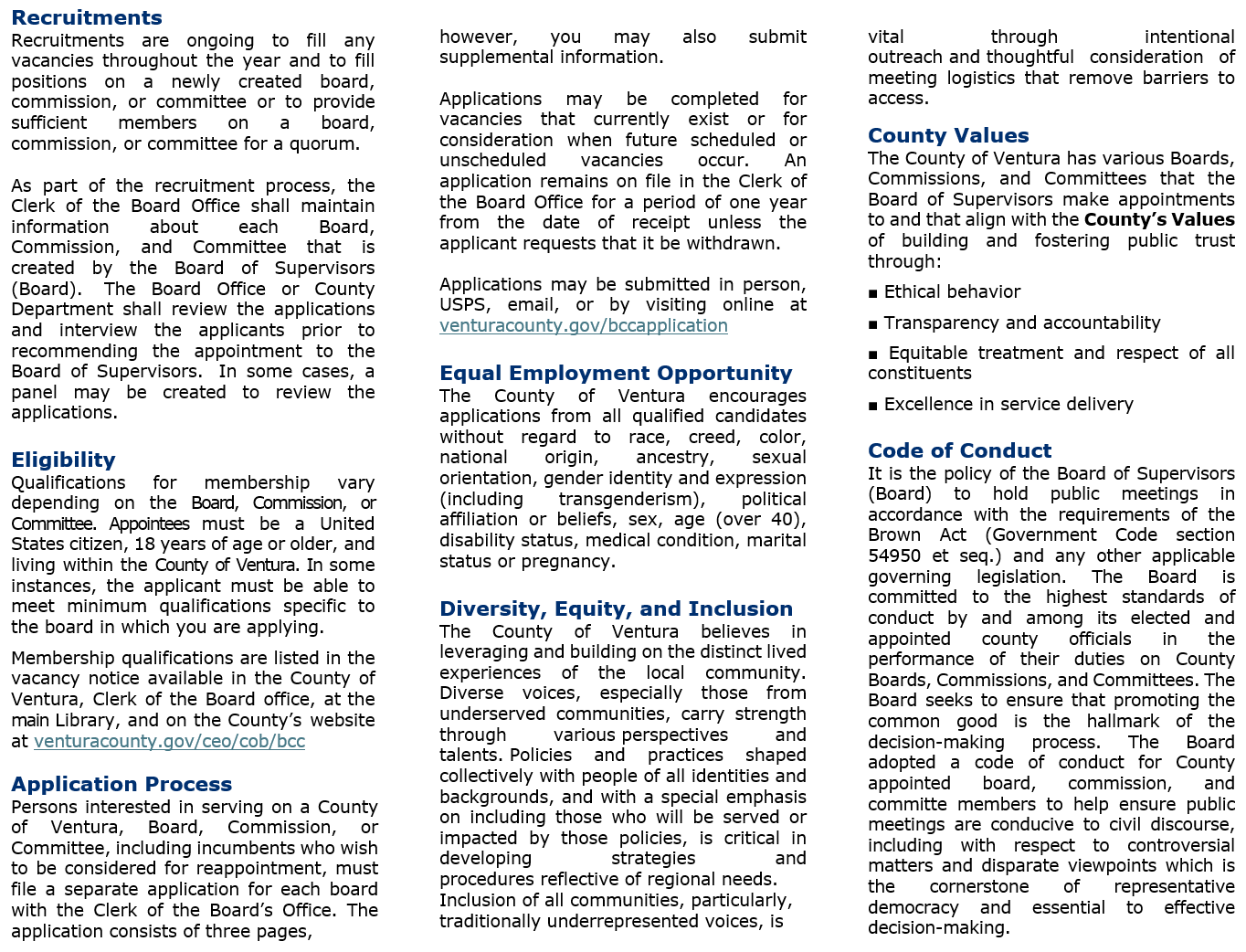 Select here to complete an electronic Application for Appointment to a Board/Commission/Committee. We recommend reviewing the positions listed on the "Current Vacancies" tab above to see which positions are currently available and then applying from that page. However, you may also apply to any of the County's Boards/Commissions/Committees by selecting this link, which will take you to the electronic application that can be completed online. If you are sharing this information with others, they may directly access the online application form by visiting www.venturacounty.gov/bccapplication