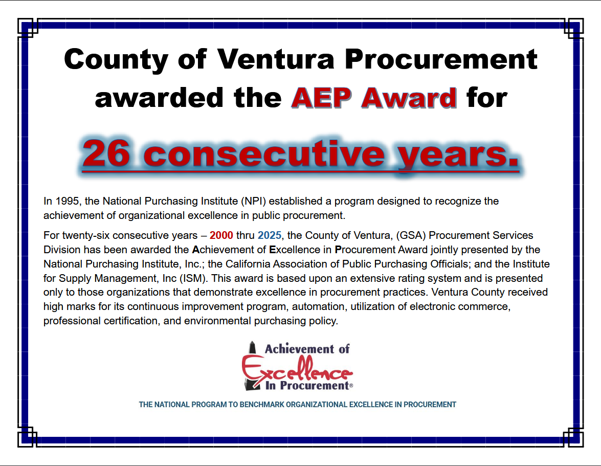 For the twenty-third year in a row, the County of Ventura, (GSA) Procurement Services Division has been selected to receive the Excellence in Procurement Award jointly presented by the National Purchasing Institute, Inc.; the California Association of Public Purchasing Officers; and the Institute for Supply Management, Inc (ISM). This award is based upon an extensive rating system and is presented only to those organizations that demonstrate excellence in procurement practices. Ventura County received high marks for its continuous improvement program, automation, utilization of electronic commerce, professional certification, and environmental purchasing policy.