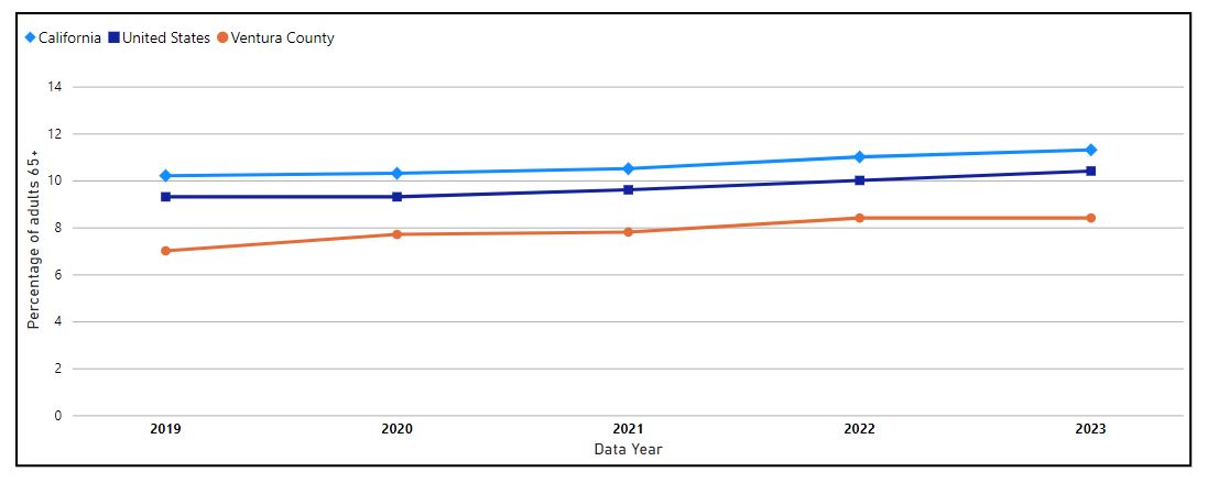 El siguiente gráfico muestra las tendencias de pobreza de los adultos mayores en el condado de Ventura, en comparación con los niveles de pobreza a nivel estatal y nacional.