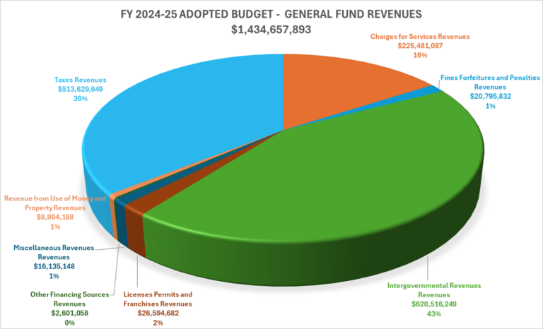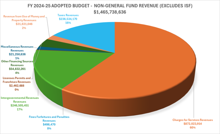 Ventura County receives funding from a variety of sources including taxes, fees for service, and state/federal government revenue. The three main sources of revenue are property tax, intergovernmental revenue, and charges for services. Intergovernmental revenue is money provided by federal or state governments to counties in order to pay for services mandated by federal or state law. Counties also derive revenue from other sources, such as locally imposed fees for services like health care services, water and sewer utilities, special taxes to fund public safety, and fees for restaurant inspections and building permits. For additional information on County revenue and expenses please see the charts and information below. You can also check out our financial transparency web site at OpenGov by clicking here.